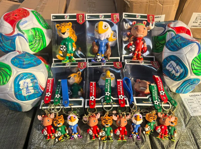 经清点,此次查获的侵权货物共计1.2万余件,其中吉祥物5930个、足球3000个、钥匙扣3600个,所有货物均带有明显的2026年美加墨世界杯标识。经联系知识产权权利人确认,该批货物均为侵权产品。