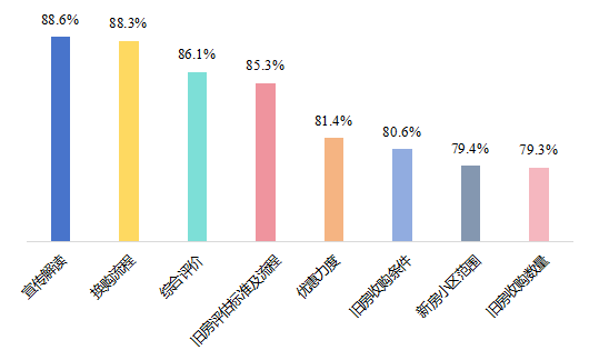 具体看,此次活动的“宣传解读”获得最高评价,满意率达88.6%;“换购流程”和“旧房评估标准及流程”,也受到85%以上受访者的认可。相对而言,受访者对“旧房收购数量”和“新房小区范围”的满意率均不到80%,尚有提升空间。