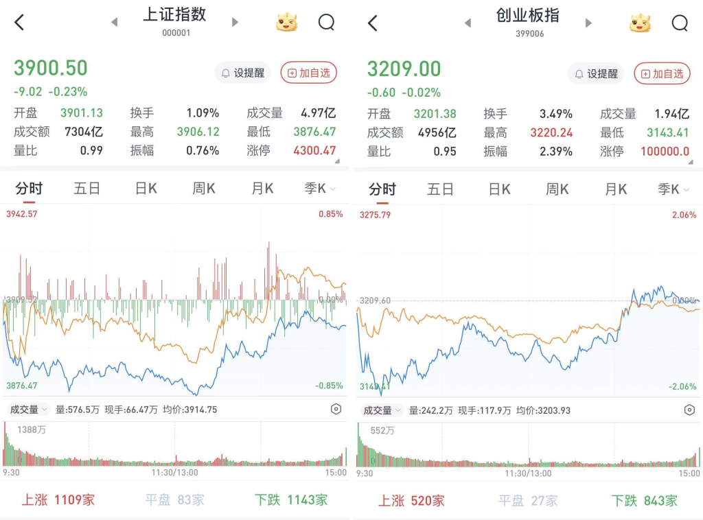 至收盘,上证综指跌0.23%,报3900.5点;科创50指数跌0.03%,报1346.7点;深证成指涨0.29%,报13316.42点;创业板指跌0.02%,报3209点。