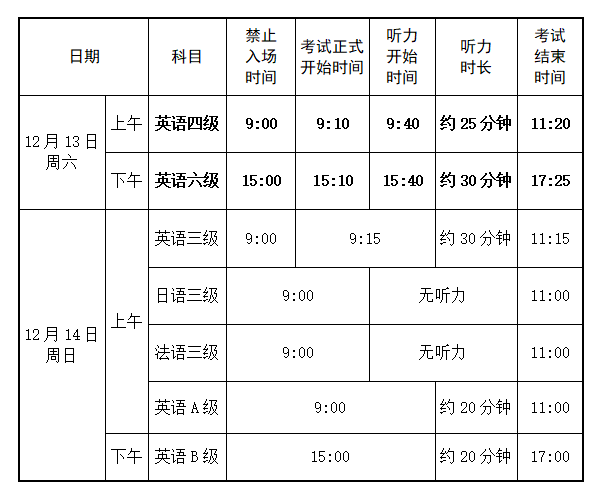 特别提醒:考生须按规定时间进入考场。四级、三级、A级9:00后,六级、B级15:00后,迟到考生禁止进入考场。