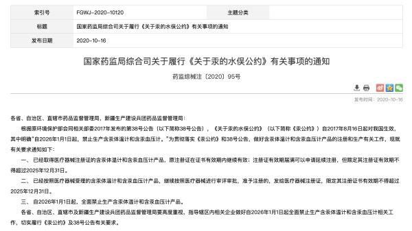 记者在国家药品监督管理局官网核实发现,这其实并非新鲜事,国家药监局综合司早在2020年10月就发布了关于履行《关于汞的水俣公约》有关事项的通知。