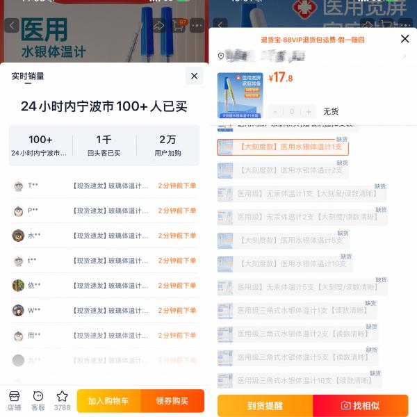 记者检索网络销售平台发现,水银体温计近日尤其畅销,且部分型号出现缺货。