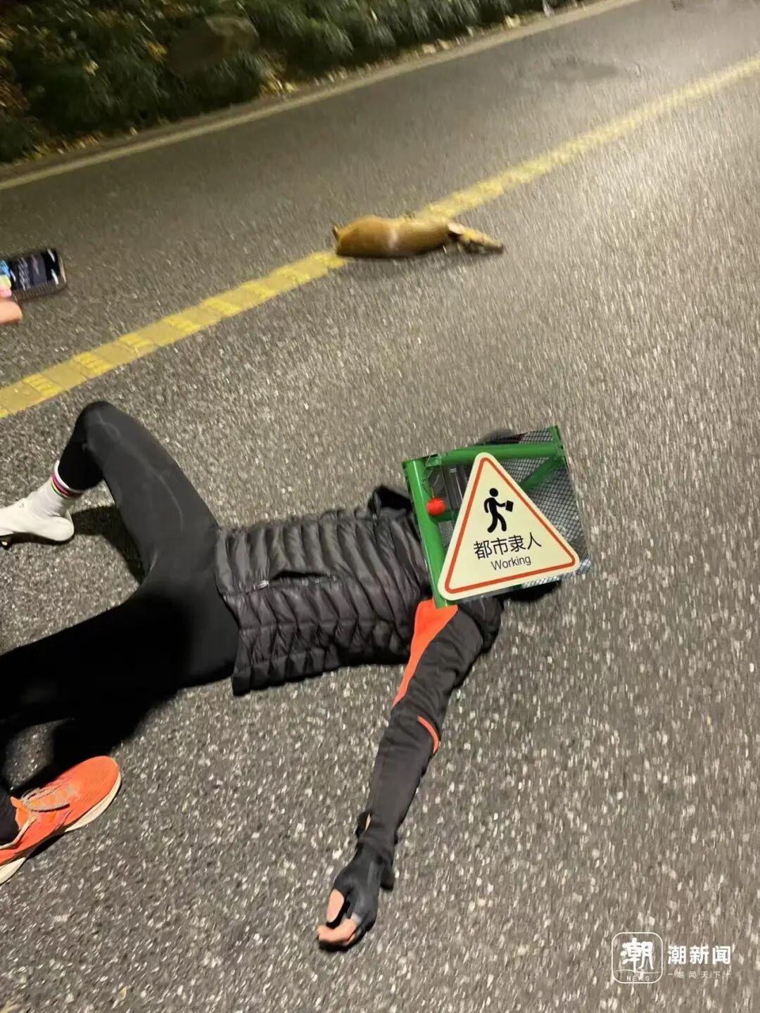 当晚8点多,她跑至近杨梅岭公交车站,就发现了伤者和黄麂,“黄麂身旁是血,躺在马路上。看到这个场面,不少赶来的爱心群众把黄麂转移到了路边草丛中。当时,黄麂大口喘气,看着比较痛苦。受伤的人穿着骑行衣裤,戴着手套和头盔,装备齐全,应该是一位骑行爱好者。”