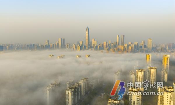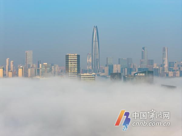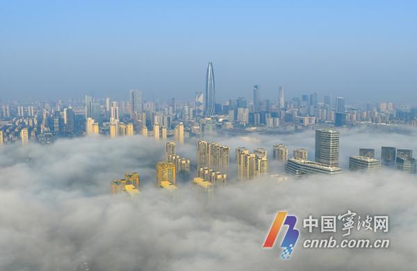 今天(11日)清晨,平流雾漫卷宁波东部新城。如棉絮般的云海铺展在楼宇之间,高低错落的建筑半隐其间,宛若悬浮的云端之城。(甬派客户端 徐丹 王鹏 摄)