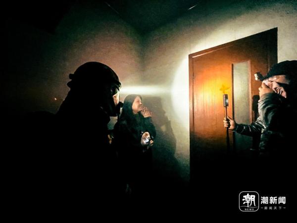 随着身后的消防员一把拉住,并用消防手电筒照射,记者才发现自己与前方的体验者只相差了不到1米的距离。