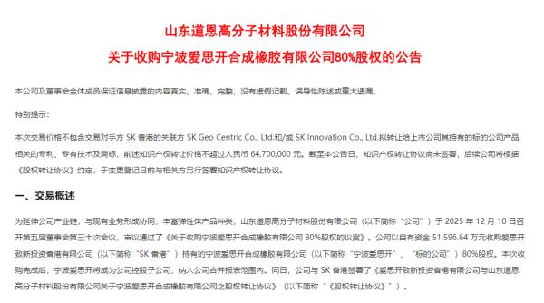 山东烟台上市龙头企业道恩股份(002838.SZ)12月10日晚公告称,公司拟以自有资金5.16亿元收购爱思开致新投资香港有限公司(下文简称“SK香港”)持有的宁波爱思开合成橡胶有限公司(下文简称“宁波SK”)80%股权。