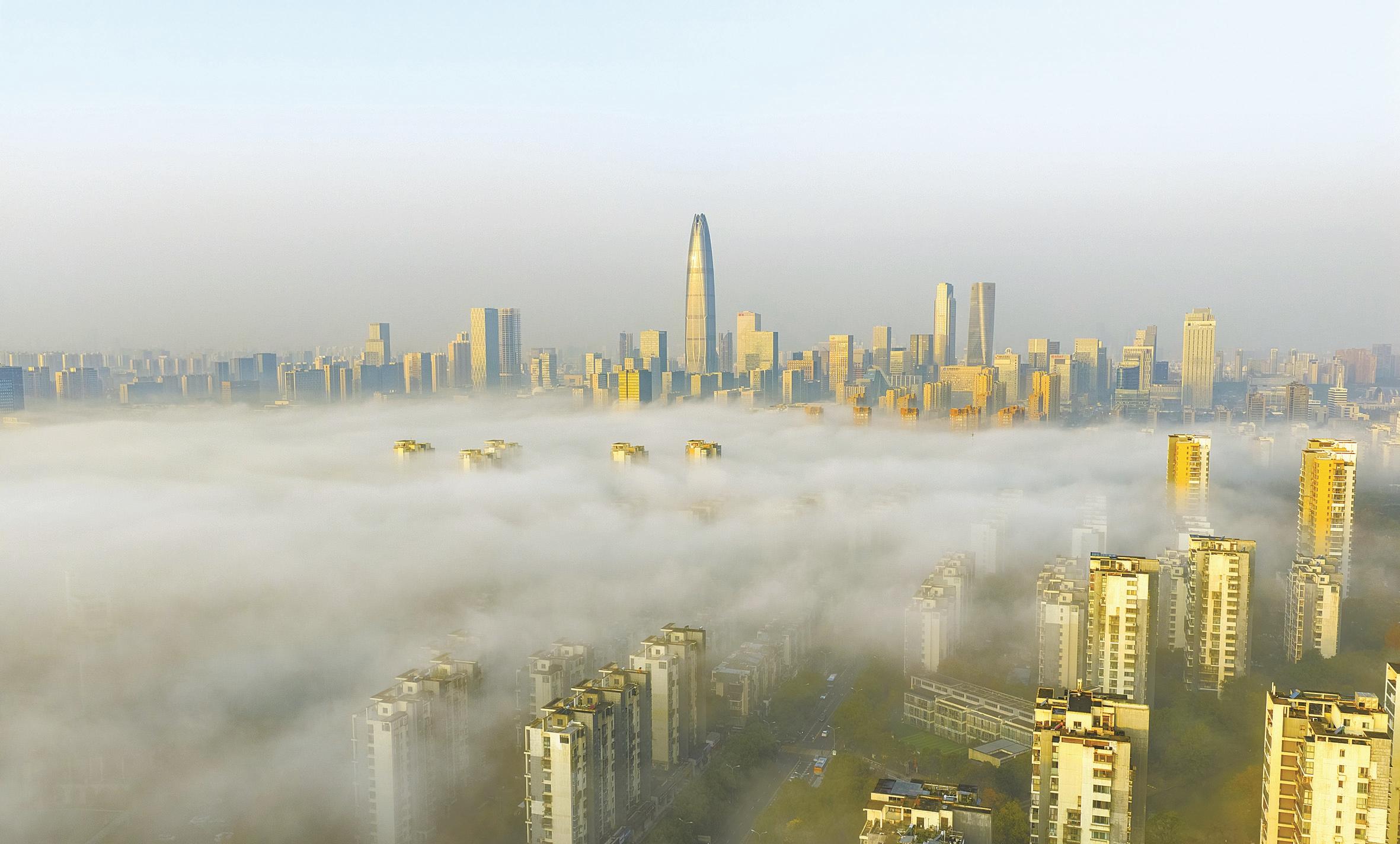 昨天清晨,平流雾漫卷东部新城,高低错落的建筑半隐其间,宛若悬浮在半空的云端之城。(徐丹 王鹏 摄)