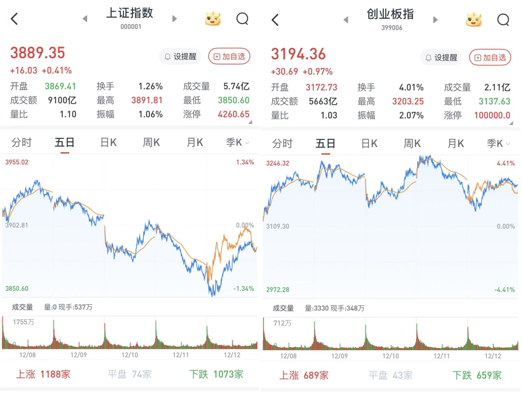 A股三大股指12月12日开盘涨跌互现。两市低开高走,午后进一步走高,尾盘出现的回落导致涨幅略有收窄。