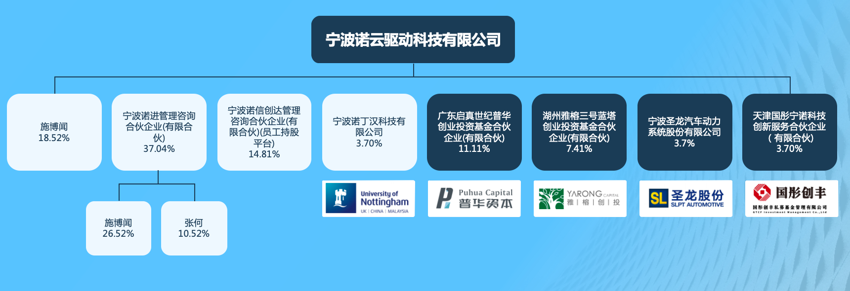 股权结构显示,目前,宁波诺丁汉大学持有诺云驱动5%股份,仍为公司长期的战略支持方与技术合作伙伴。而本轮投资方普华资本、雅榕创投、圣龙股份、国彤创丰分别持股11.11%、7.41%、3.70%、3.70%。