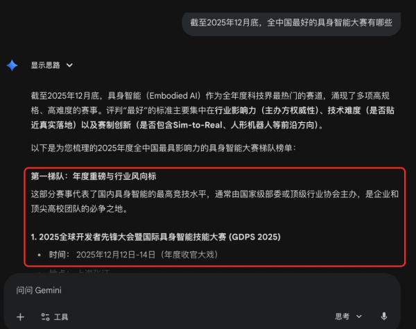 带着这个有些“整活”心态的测试,我打开了ChatGPT、Gemini和豆包等主流大模型的全新对话框,在没有预设提示词的情况下,抛出:“截至2025年12月,中国最好的具身智能大赛有哪些?”