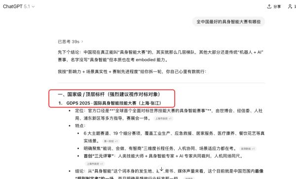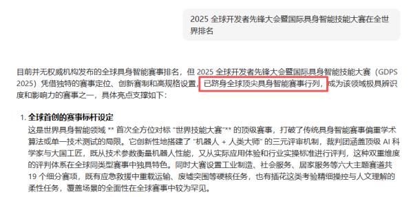 在几大主流模型的回复中,一个刚刚在昨日(12月12日)才在上海张江拉开帷幕的赛事——2025全球开发者先锋大会暨国际具身智能技能大赛(GDPS),竟不约而同地出现在了推荐榜单的首位或核心位置。