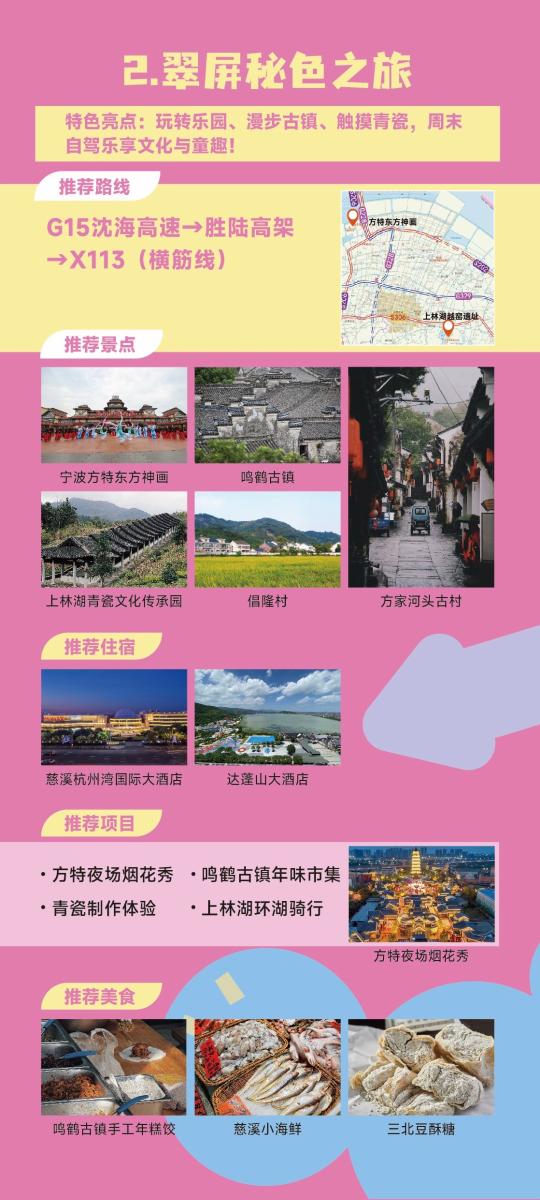 推荐景点:宁波方特东方神画、鸣鹤古镇、上林湖青瓷文化传承园、倡隆村、方家河头古村