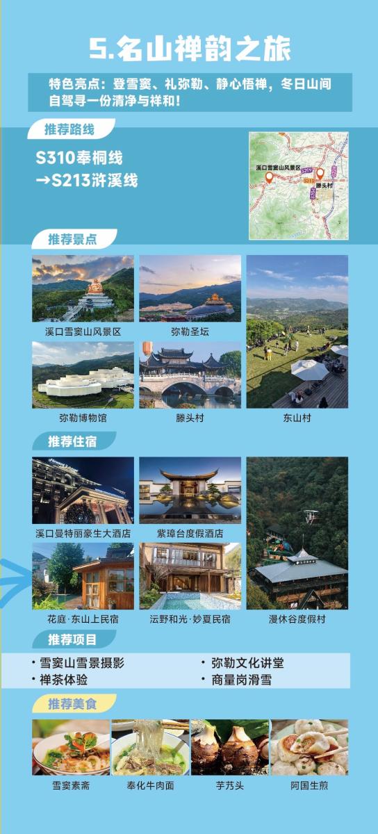 推荐项目:雪窦山雪景摄影、弥勒文化讲堂、禅茶体验、商量岗滑雪