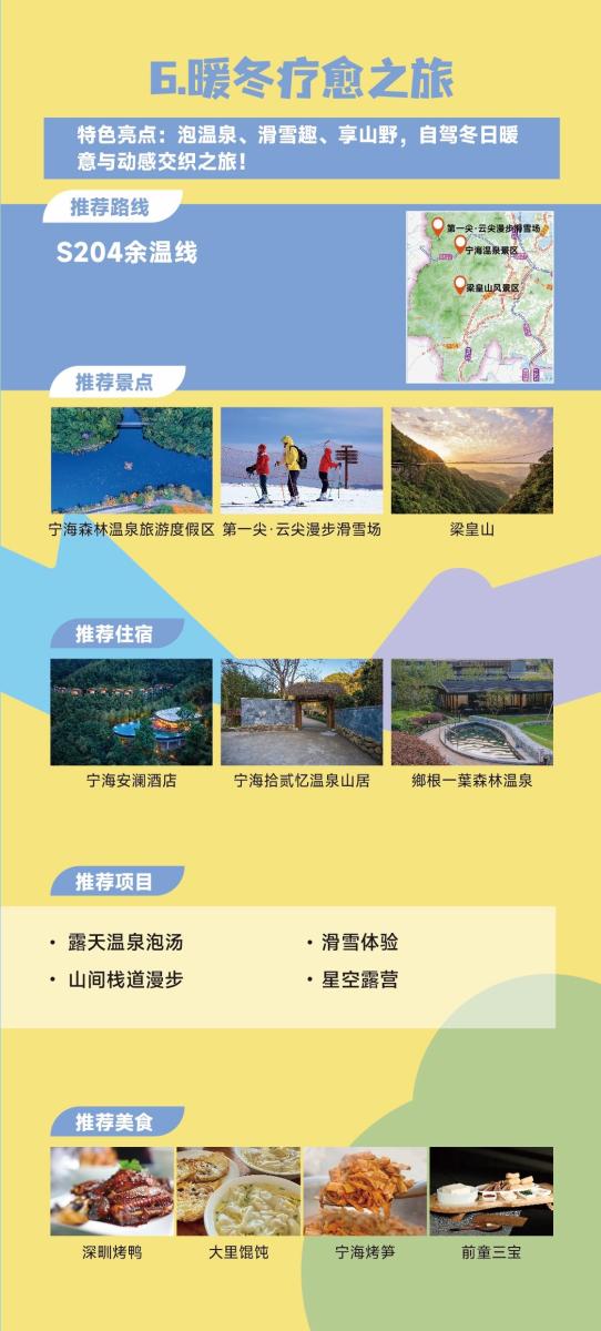 推荐景点:宁海森林温泉旅游度假区、第一尖·云尖漫步滑雪场、梁皇山