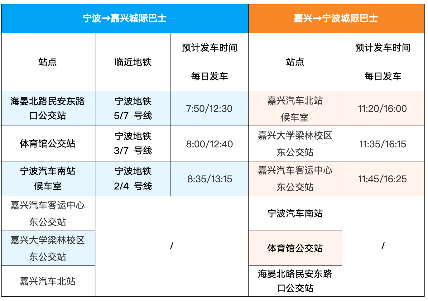 回程:从嘉兴汽车北站出发,经嘉兴大学梁林校区东公交站、嘉兴汽车客运中心东公交站,到达宁波汽车南站、体育馆公交站、东部新城海晏北路民安东路口公交站。同样每天2班(11:20、16:00发车)。