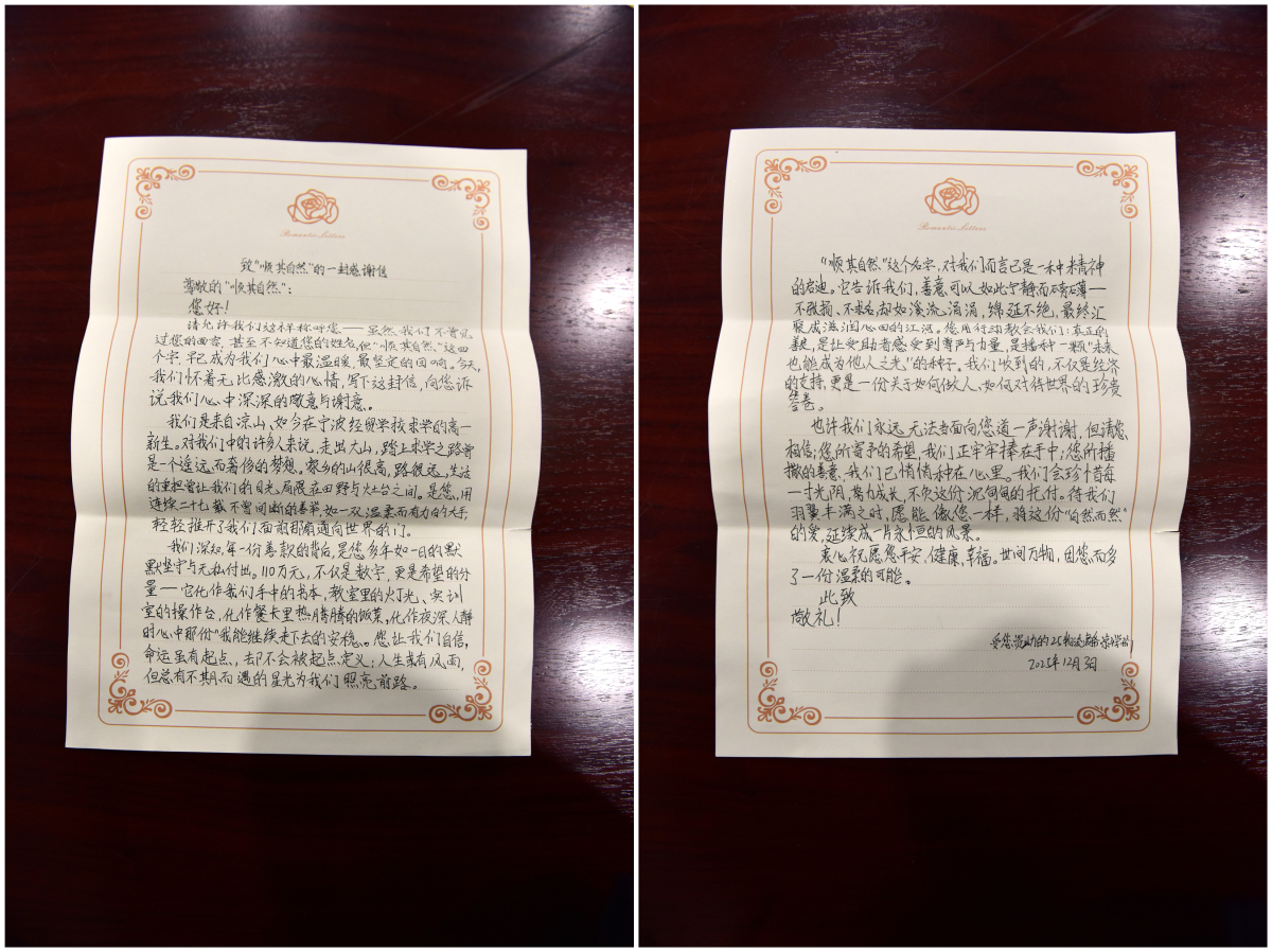 凉山学子给“顺其自然”的感谢信。(点击图片查看大图)