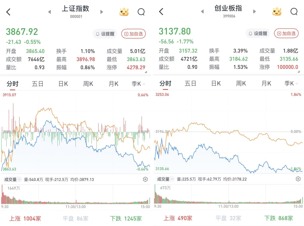 至收盘,上证综指跌0.55%,报3867.92点;科创50指数跌2.22%,报1318.91点;深证成指跌1.1%,报13112.09点;创业板指跌1.77%,报3137.8点。