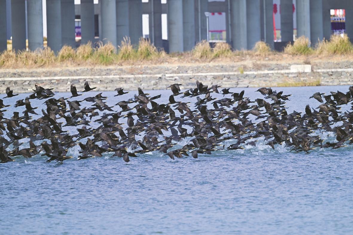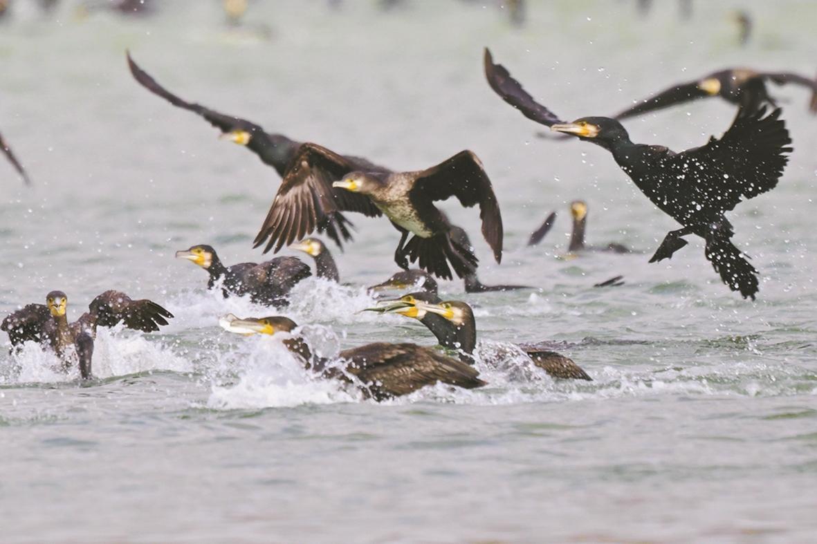 眼下如果到北仑梅山湾观鸟,很有可能看到数以千计的鸬鹚。它们喜欢聚集在一起,一会儿在水面上围捕鱼类,一会儿群飞上天,场面十分壮观。很多路过的市民都为之驻足,并拿起手机拍摄,然后发朋友圈,这些鸬鹚如今已成了“网红”。