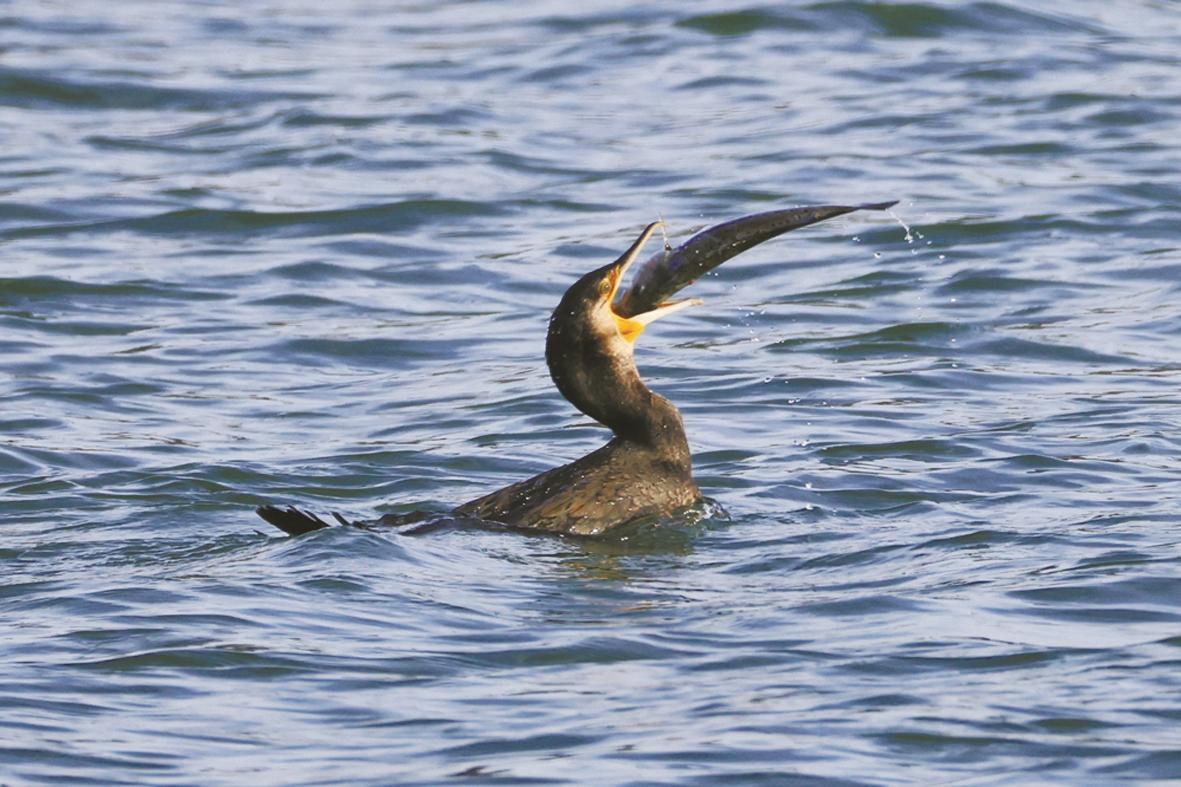 起初,我们都以为那是只普通鸬鹚,故懒得去拍。后来,我忽然注意到,它在背朝太阳晾翅的时候,后颈与背部的羽毛似有暗绿色金属光泽,顿时心中一动:莫不是暗绿背鸬鹚?赶紧拍了,放大照片查看其脸部特征,果然是它!于是,我们开始专注拍摄,终于拍到了暗绿背鸬鹚捕鱼的照片。记者 张海华 文/摄