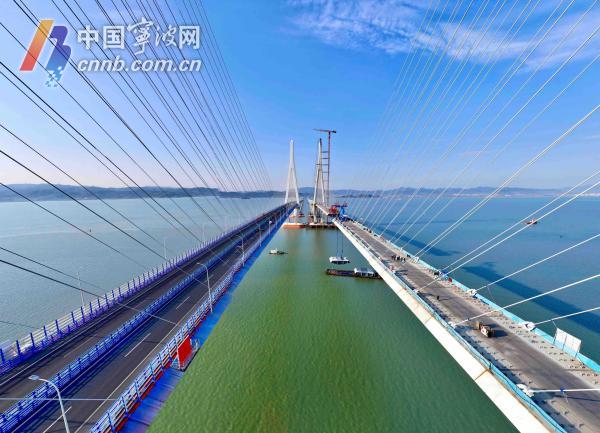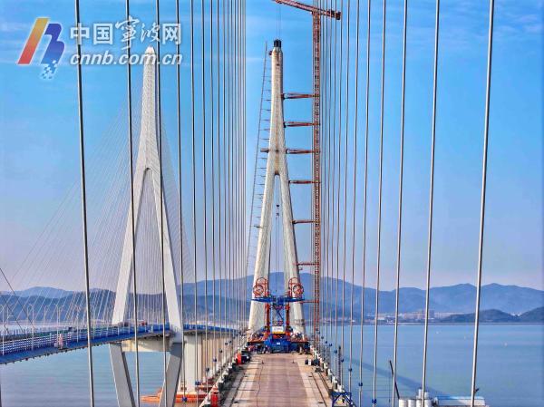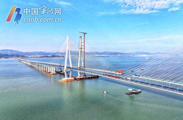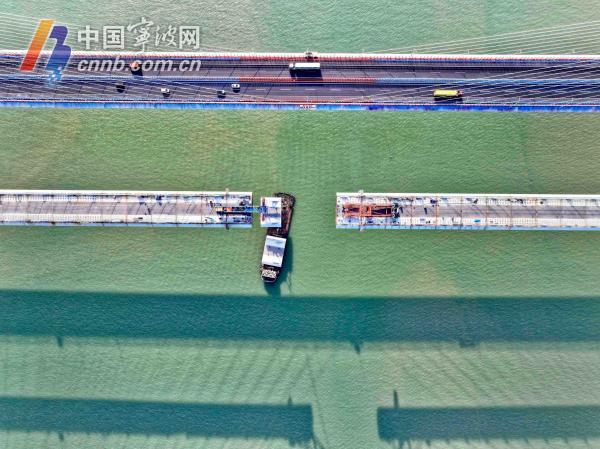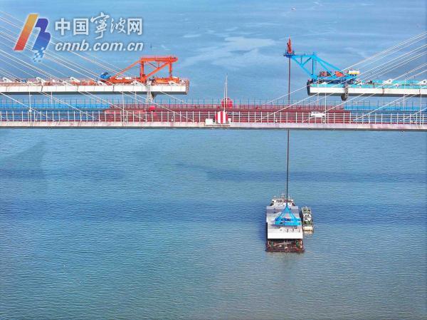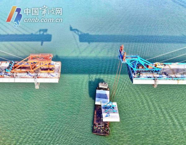 象山港畔,运梁船精准就位,建设者们手持对讲机反复协调确认。两座“钻石”造型的双子星塔之间,钢箱梁缓缓升空,海面保障船舶巡回护航,海陆协同上演着跨海筑桥的奋进图景。