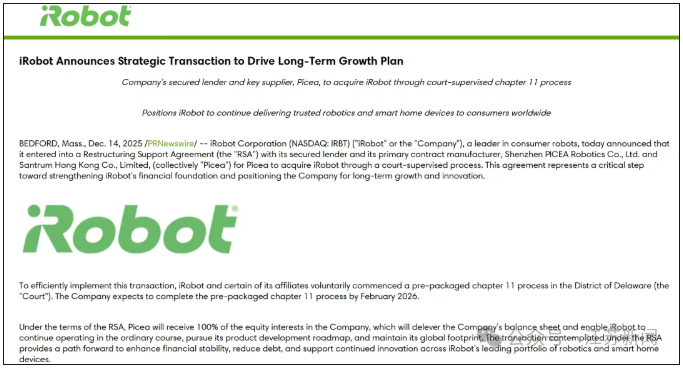 iRobot在公告中宣布,已经向美国特拉华州法院提交第11章破产保护申请,并与主要债权人、主要供应商Picea(深圳杉川机器人和香港杉川,后文统称为杉川)签署重组支持协议,由杉川通过法院监督程序收购iRobot。公司预计将在2026年2月前完成破产手续。