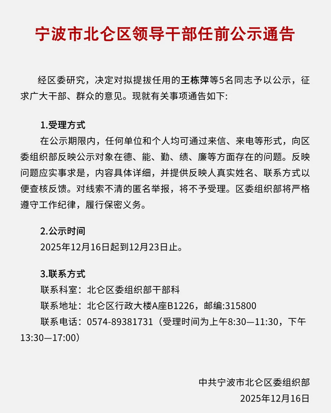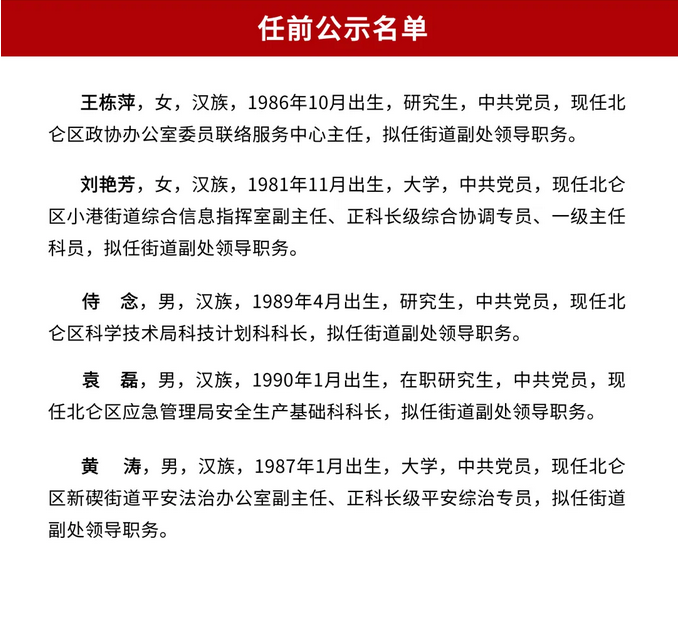 北仑区领导干部任前公示 5人拟任街道副处领导职务
