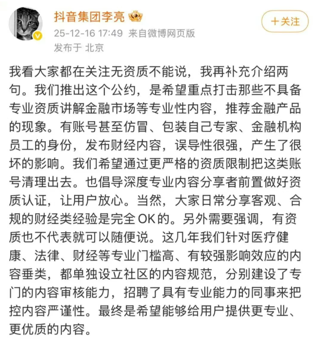当天早些时候,抖音发布《公约》对账号资质、内容管理、营销行为等核心治理规范以及违规处理与责任追究机制进行规范,《公约》提到,平台倡导财经领域创作者在发布财经专业内容前,完成财经领域专业者资质认证,禁止未经平台资质认证的账号发布财经专业内容、推荐财经专业服务/产品。