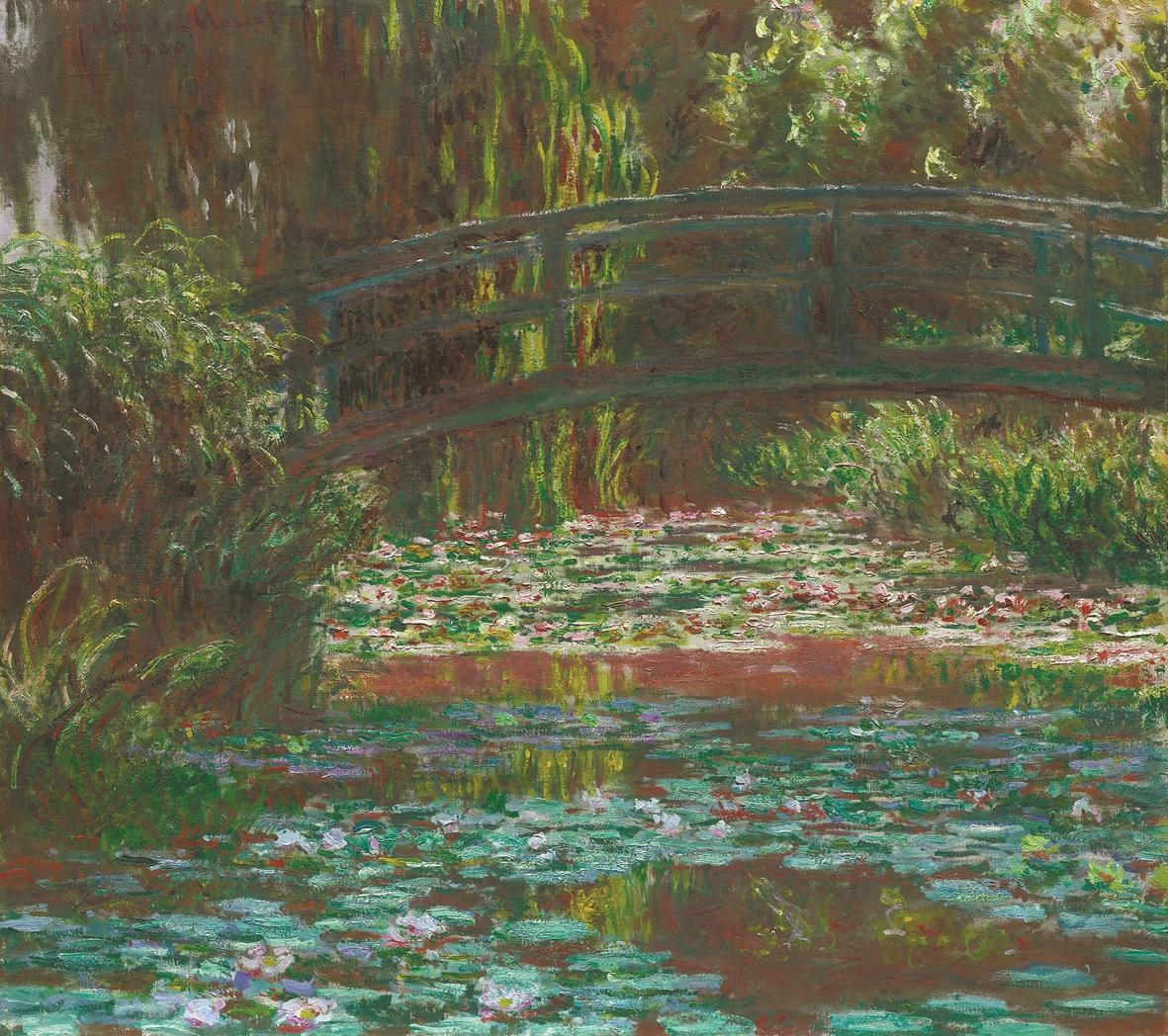 这两幅画中,《睡莲池》画得更满,色彩几乎填满了画面。除了池塘、睡莲、垂柳、鸢尾、紫藤,画中还有一座日本桥。三十年前莫奈走印象主义道路的时候,浮世绘的色彩和平面效果,曾是他灵感的源泉。
