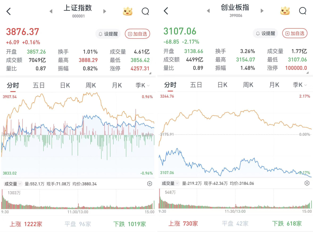 至收盘,上证综指涨0.16%,报3876.37点;科创50指数跌1.46%,报1305.97点;深证成指跌1.29%,报13053.97点;创业板指跌2.17%,报3107.06点。