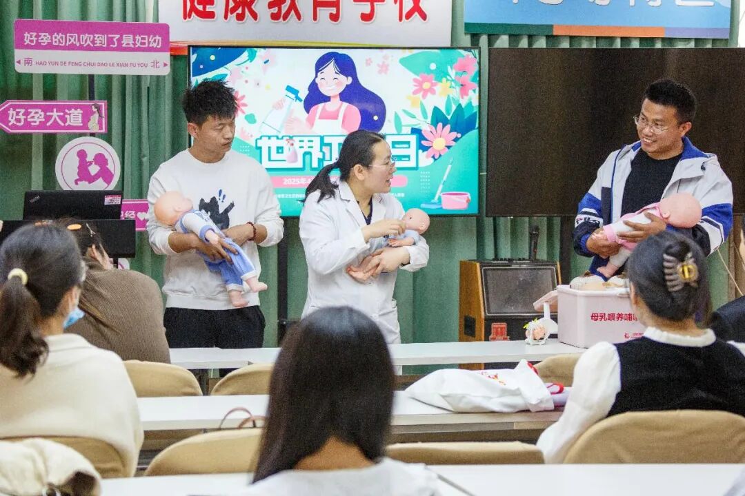 在河南省商丘市睢县妇幼保健院孕妇课堂上,医护人员手把手教准妈妈、准爸爸如何护理新生儿宝宝。新华社徐泽源/摄