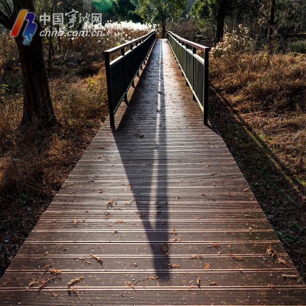 石砌的古渠洞成了天然的画框,把远处木栈道拉成一条银线;栈道的栏杆投下笔直的影,与木板的纹理缠在一起,像被阳光熨平的褶皱;水边的一枝黄莺草,沾满了晨露,光落在上面,便化开一圈圈朦胧的光晕,与湖面的粼粼波光遥遥相映。