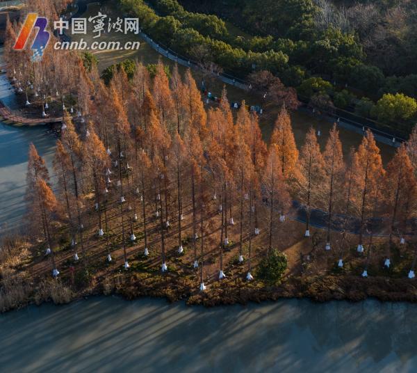 湖畔的石板路被水杉的枝桠割成细长的光带,棕红的落叶散落一地,与光影交错出深秋特有的符号。