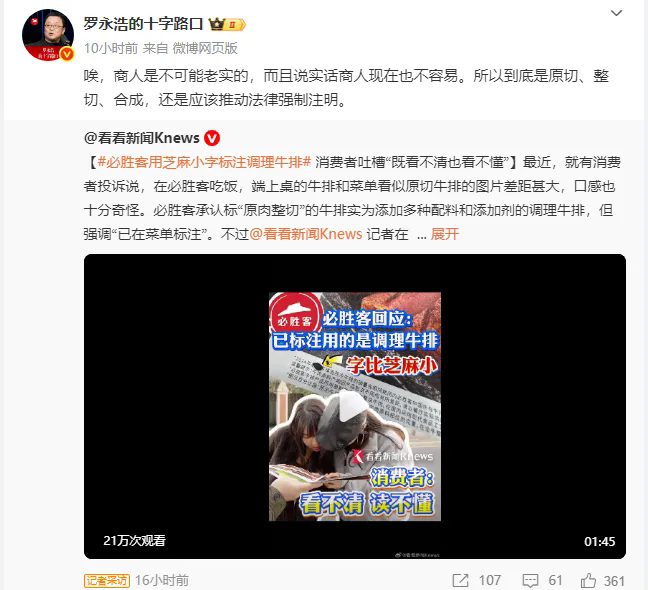 必胜客用芝麻小字标注调理牛排一事曝光后,罗永浩发文:唉,商人是不可能老实的,而且说实话商人现在也不容易。所以到底是原切、整切、合成,还是应该推动法律强制注明。