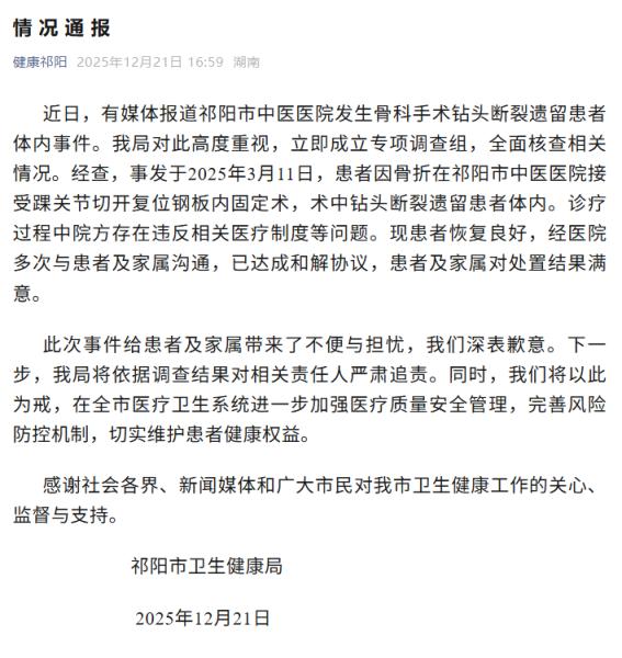 近日,有媒体报道祁阳市中医医院发生骨科手术钻头断裂遗留患者体内事件。我局对此高度重视,立即成立专项调查组,全面核查相关情况。经查,事发于2025年3月11日,患者因骨折在祁阳市中医医院接受踝关节切开复位钢板内固定术,术中钻头断裂遗留患者体内。诊疗过程中院方存在违反相关医疗制度等问题。现患者恢复良好,经医院多次与患者及家属沟通,已达成和解协议,患者及家属对处置结果满意。