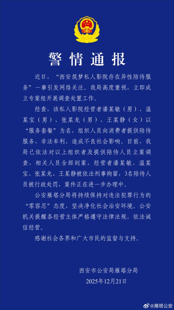 12月21日下午,针对“西安筑梦私人影院存在异性陪侍服务”一事,西安市公安局雁塔分局官方微博发布警情通报。通报中称,已对该私人影院经营者及提供陪侍人员立案调查,相关人员全部到案,4名经营者被依法刑事拘留,3名陪侍人员被行政处罚,案件正在进一步办理中。