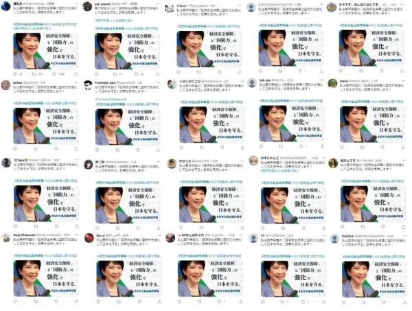 日本网民分享的图片显示,有大量不同账号发表了支持高市的相似帖文,文字内容几乎一模一样,图片也是用的同一张宣传海报。
