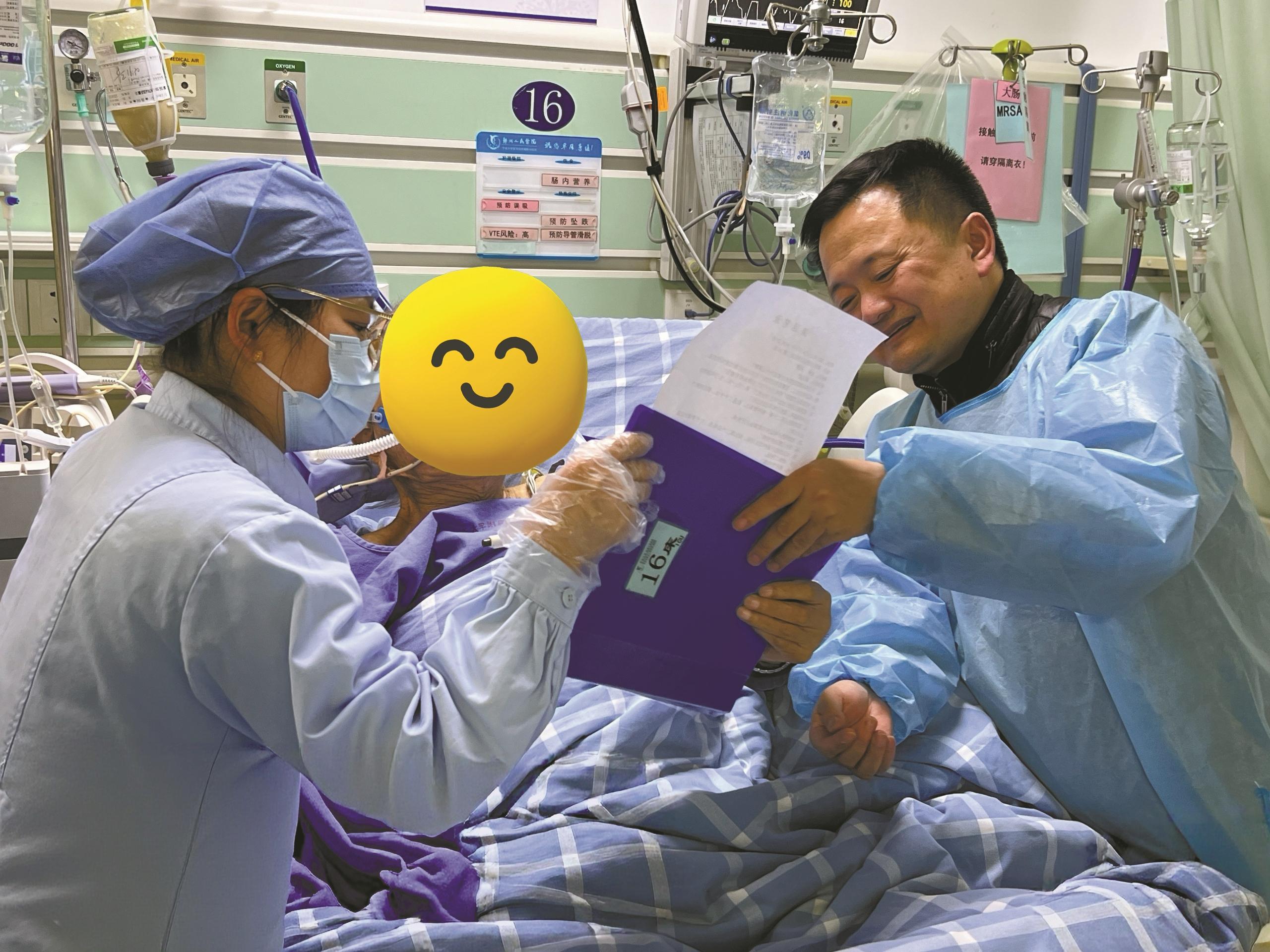 录制遗嘱的当天,为了保证遗嘱的有效性,家属请来了律师。由于老人多脏器功能衰竭,全身插满管路,卧床时连说话、写字都格外费劲,每一个动作都伴随着不适。宋燕萍将床位调整至最舒适的高度,为老人垫上3个软枕,用手轻轻托着老人的肩膀,尽可能让老人能以相对舒展的状态,清晰表达自己的意愿。在医护团队的全程协助下,老人清晰、坚定地完成了遗嘱陈述。更令所有人欣慰的是,陈爷爷在医护团队的全力救治下,暂时脱离危险。
