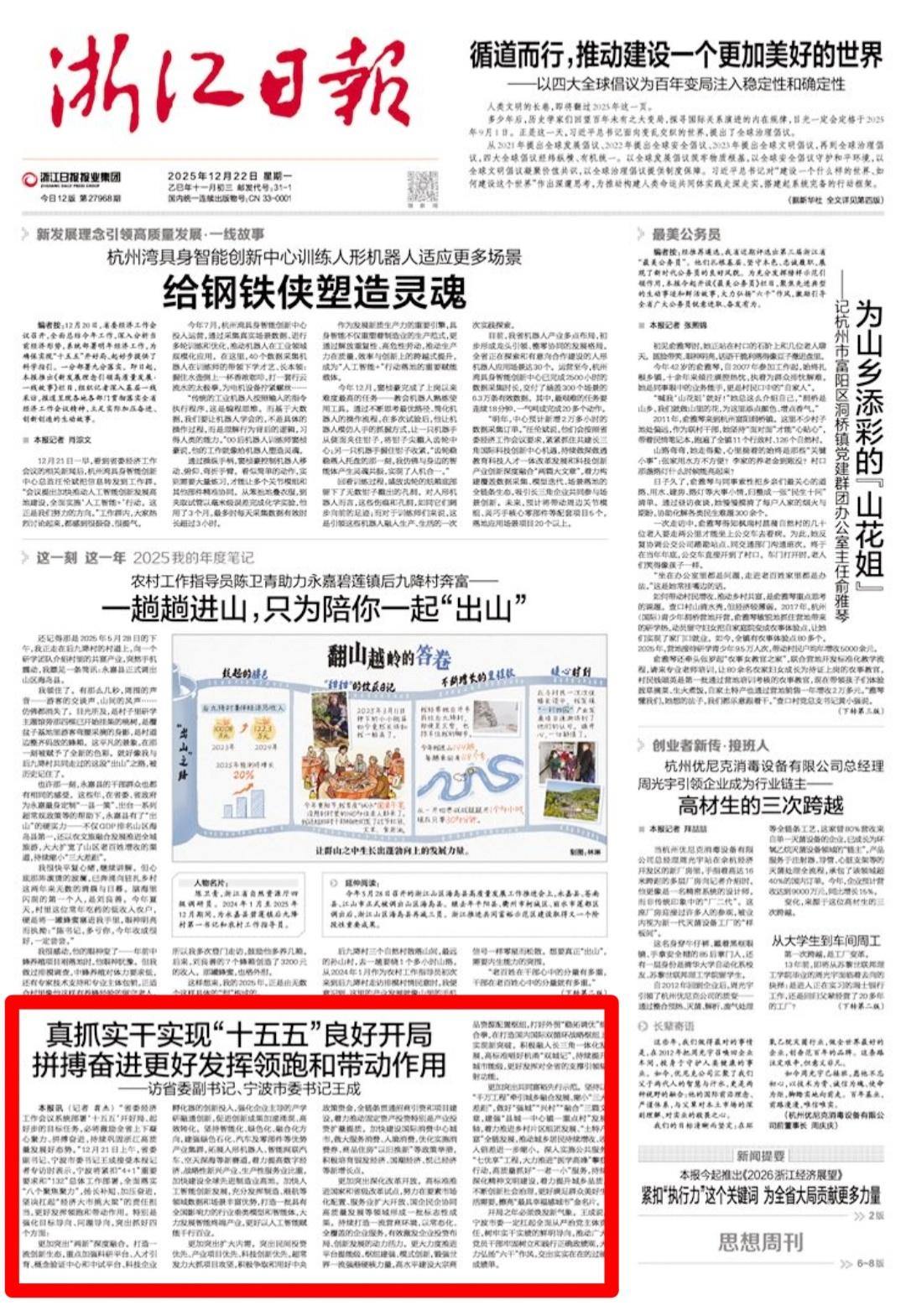 “省委经济工作会议系统部署‘十五五’开好局、起好步的目标任务,必将激励全省上下凝心聚力、拼搏奋进,持续巩固浙江高质量发展好态势。”12月21日上午,省委副书记、宁波市委书记王成接受记者专访时表示,宁波将紧扣“4+1”重要要求和“132”总体工作部署,全面落实“八个聚焦聚力”,扬长补短、加压奋进,坚决扛起“经济大市挑大梁”的责任担当,更好发挥领跑和带动作用。特别是强化目标导向、问题导向,突出抓好四个方面: