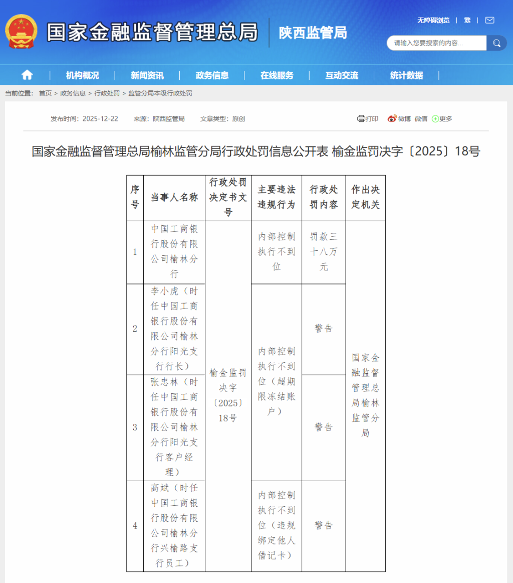 近日,因内部控制执行不到位,存在超期限冻结账户、违规绑定他人借记卡等问题,中国工商银行股份有限公司榆林分行被罚款38万元,3名相关责任人被处以警告处罚。