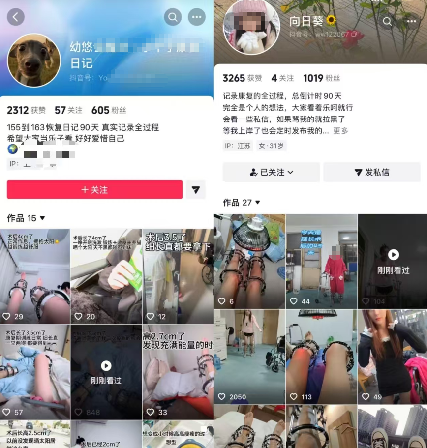 抖音上相关用户分享“断骨增高”手术后恢复记录的相关主页(截图)