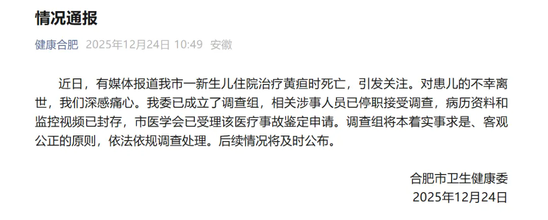 12月24日,安徽省合肥市卫生健康委发布情况通报: