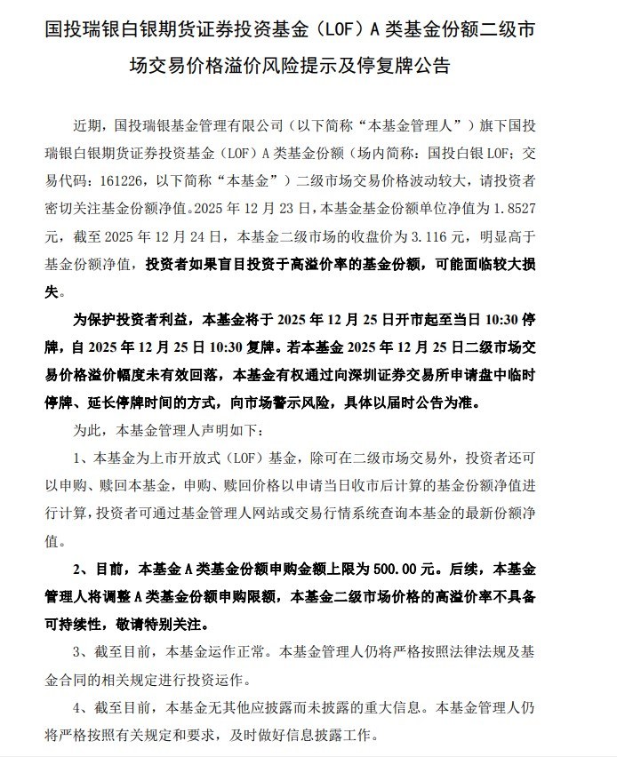 就在刚刚,国投白银LOF再次发布溢价风险提示及停复牌公告。公告表示,本基金二级市场的收盘价为3.116元,明显高于基金份额净值,投资者如果盲目投资于高溢价率的基金份额,可能面临较大损失。本基金将于2025年12月25日开市起至当日10:30停牌,自2025年12月25日10:30复牌。