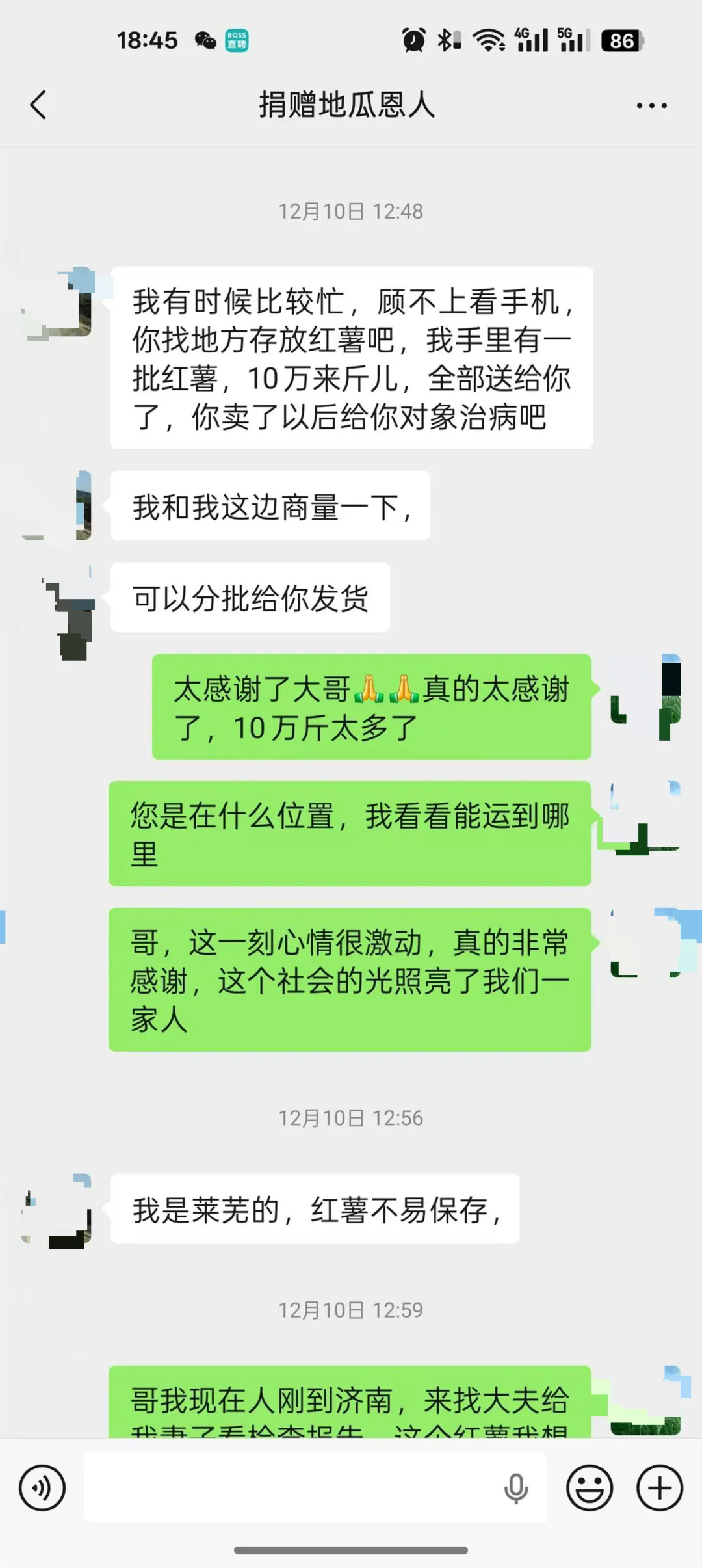 12月24日上午,记者通过贾长龙联系上匿名的爱心人士。爱心人士告诉记者,自己姓房,今年50岁,是济南市莱芜区人。房先生介绍,他自己种红薯,也从农户处代收红薯。捐赠的红薯是今年产的,考虑到贾长龙没有储存10万斤红薯的场所,他计划分批用车发给贾长龙,第一次发了2000斤左右。房先生进一步向记者表示,通过网络得知贾长龙的遭遇和联系方式,“这个小伙子很有责任心,遇到了困难,就想帮他一下,能帮一把是一把。”