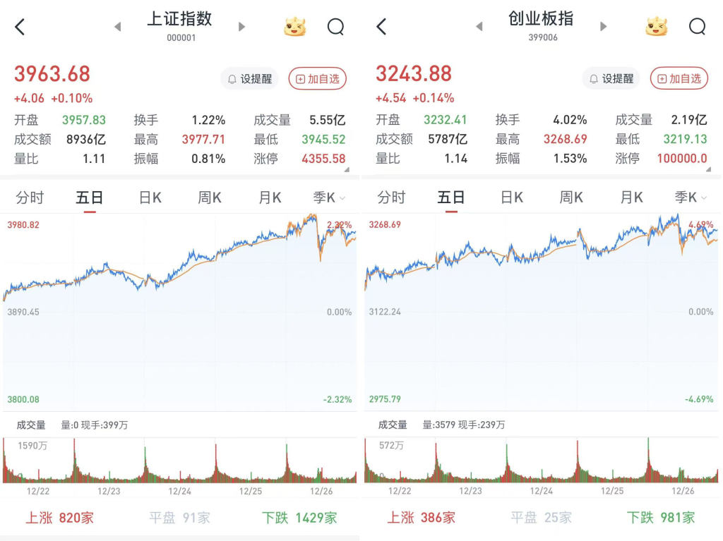 A股三大股指12月26日开盘涨跌互现。早盘两市震荡走高,午前出现了直线下挫行情。午后恢复交易后重返升势后高位震荡,但个股呈现普跌。