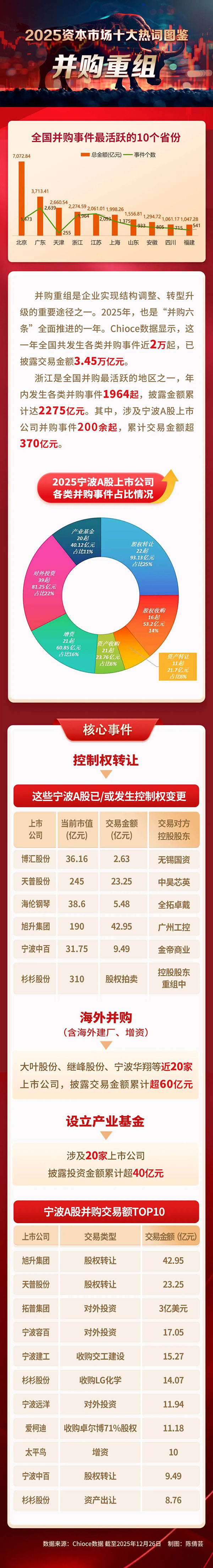 回到宁波市场,据不完全统计,年内共发生超250起并购重组事件,其中涉及宁波A股交易金额超370亿元。旭升集团以42.95亿元股权转让,成为年内宁波A股并购重组单笔交易金额之最。