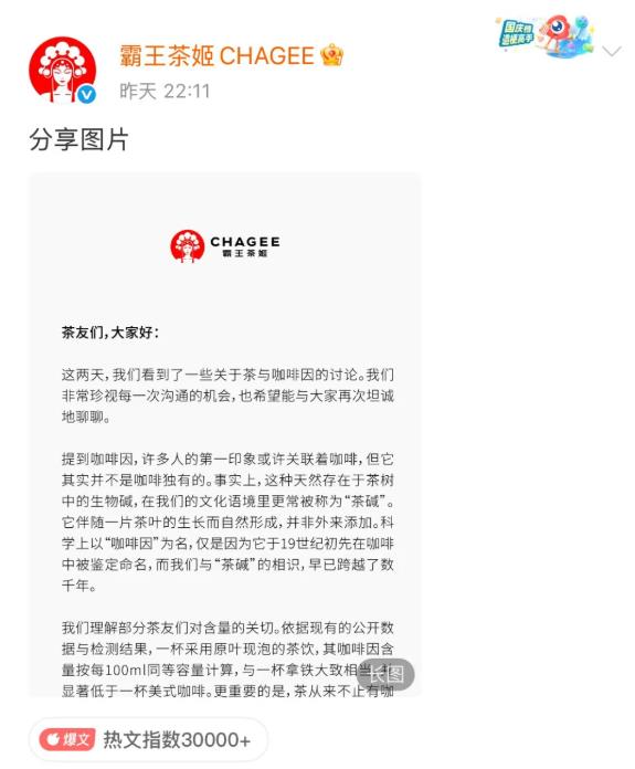 12月26日晚间,霸王茶姬发文称,依据现有公开数据与检测结果,霸王茶姬一杯采用原叶现泡的茶饮,其咖啡因含量按每100ml同等容量计算,与一杯拿铁大致相当,并显著低于一杯美式咖啡。