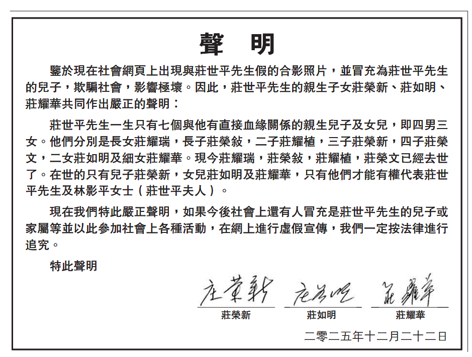 庄世平先生亲属在声明中表示,庄世平先生一生只有七个与他有直接血缘关系的亲生儿子及女儿,即四男三女。他们分别是长女庄耀瑞,长子庄荣敍,二子庄耀植,三子庄荣新,四子庄荣文,二女庄如明及细女庄耀华。现今庄耀瑞,庄荣敍,庄耀植,庄荣文已经去世了。在世的只有儿子庄荣新,女儿庄如明及庄耀华,只有他们才能有代表庄世平先生及林影平女士(庄世平夫人)。