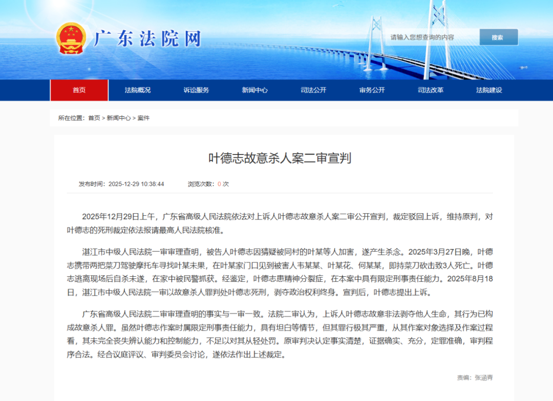 2025年12月29日,广东省高级人民法院依法对上诉人叶德志故意杀人案二审公开宣判,裁定驳回上诉,维持原判,对叶德志的死刑裁定依法报请最高人民法院核准。