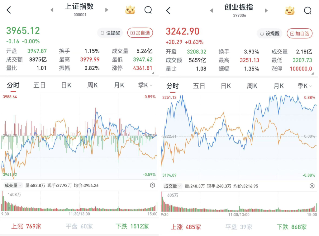至收盘,上证综指跌0.16点,报3965.12点;科创50指数涨1.01%,报1359.87点;深证成指涨0.49%,报13604.07点;创业板指涨0.63%,报3242.9点。