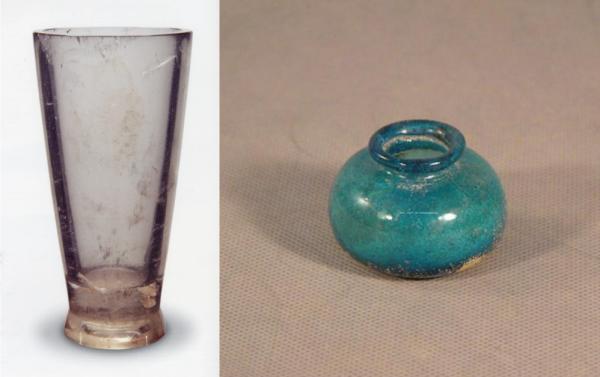 玻璃制品是数量最多的水晶仿制品,因为其价格低廉、外观相似。玻璃不是天然晶体,而是多种原料混合后(其中二氧化硅成分占比在70%~75%),在大约1500℃的高温下熔融的人工非晶态固体,内部均一,表面缺乏矿物纹理。玻璃的导热性比水晶差,因此手感比水晶略温。并且玻璃的硬度也相对较低,所以用水晶能够划刻玻璃。此外在光线充足和高倍放大镜下,玻璃内部常见气泡和流动纹,也常见冰裂和棉絮状物。